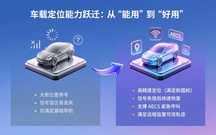 随着《车载事故紧急呼叫系统》(AECS)、电动汽车远程服务与管理系统等强制性法规落地,车载定位的使命已发生根本变化:它不再是“大致位置”的参考,而是决定紧急呼叫能否成功、信号盲区能否精准定位、远程监管能否提供可信轨迹的关键。因此,车规高精度定位、毫秒级响应、全天候可靠,不再是技术“加分项”,而是法规准入与生命安全的必备前提。